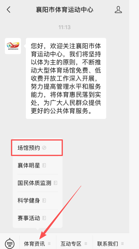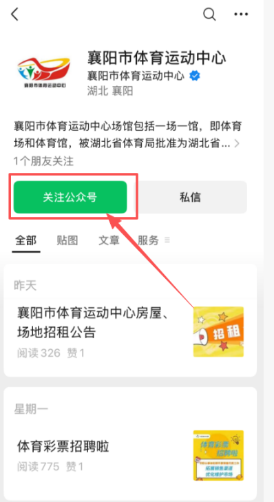 1. 微信搜索并关注 “襄阳市体育运动中心” 官方公众号;