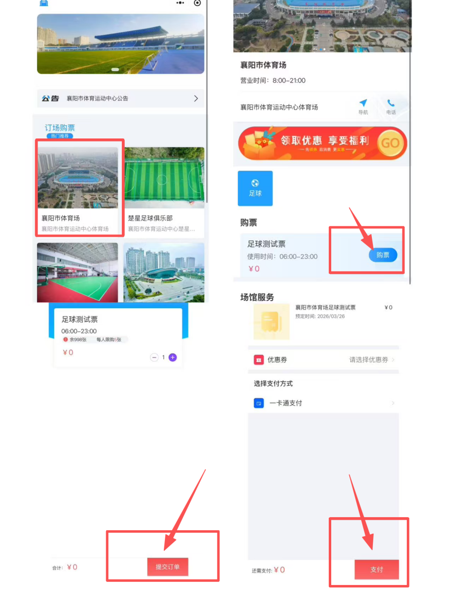 3.点击“襄阳市体育场”→足球测试票购票→提交订单→支付