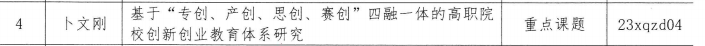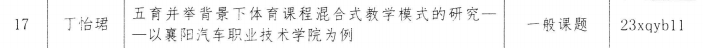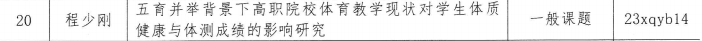 5月22日,我校2023年科研课题立项名单公布,公共课部共有3项校级课题获批立项。本次课题申报工作经部门申报、学校材料初审、关联重复性、学术委员会网上评审,集中评议等环节,卜文刚主任主持的《“基于‘专创、产创、思创、赛创’四融一体的高职院校创新创业教育体系研究》立项为重点课题,程少钢主持的《“五育并举背景下高职院校体育教学现状对学生体质健康与体测成绩的影响研究”》、丁怡珺主持的《“五育并举背景下体育课程混合式教学模式的研究——以襄阳汽车职业技术学院为例”》立项为一般课题。